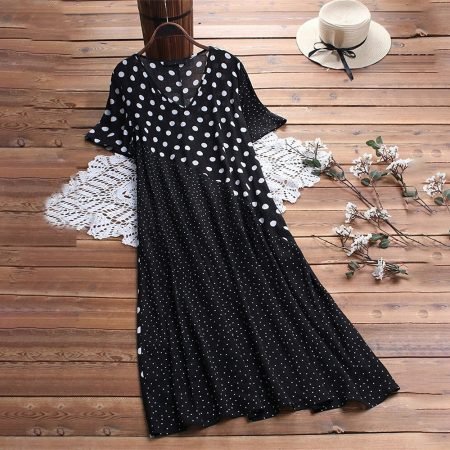 $65.99Original price was: $65.99.$42.99Current price is: $42.99.Description: Neckline: V-neck Sleeve Length: Short Sleeve Dress Length: Midi Pattern Type: Polka Dot Silhouette: A-line Material: 35% Elastane, 65% Rayon Machine Washable Size Chart: Size Bust Length Sleeves inch cm inch cm inch cm S 38 96 46 117 9 22 M 39 100 47 120 9 23 L 41 105…