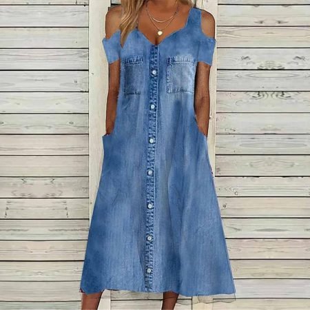 $97.99Original price was: $97.99.$65.99Current price is: $65.99.Description: Neckline: V-Neck Sleeve Length: Short Sleeve Dress Length: Midi Pattern Type: Plain Silhouette: A-line Side Pockets Material: Denim Machine Washable Size Chart: Size Bust Length Sleeves inch cm inch cm inch cm S 38 96 46 117 4 9 M 39 100 47 120 4 10 L 41 105 48 123 4 11…