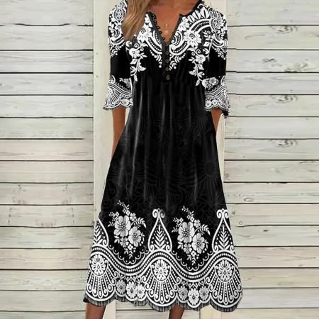 $63.99Original price was: $63.99.$47.99Current price is: $47.99.Description: This 3/4 sleeve prairie midi dress features versatile side pockets, giving it a laid-back vibe. A bright white lace print with black makes this dress stand out with a statement in style, perfect for wearing any time. The trimmed plunging v-neck round collar and button front keep it casual. Finish…