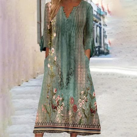 $66.99Original price was: $66.99.$47.99Current price is: $47.99.Description: Neckline: V-neck Sleeve Length: 3/4 Sleeve Dress Length: Midi Pattern Type: Print Silhouette: A-line Side Pockets Material: 45% Elastane, 55% Rayon Machine Washable Size Chart: Size Bust Length Sleeves inch cm inch cm inch cm S 36 92 46 117 18 45 M 38 96 47 120 18 46 L 40…