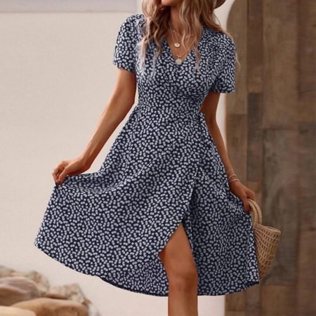 Description: Neckline: V-neck Sleeve Length: Short Sleeve Dress Length: Midi Silhouette: A-line Pattern Type: Print Thigh-high Side Slit Material: 45% Elastane, 55% Rayon Machine Washable Size Chart: Size Bust Length Sleeves inch cm inch cm inch cm S 36 92 44 113 7 19 M 38 96 45 115 8 20 L 40…
