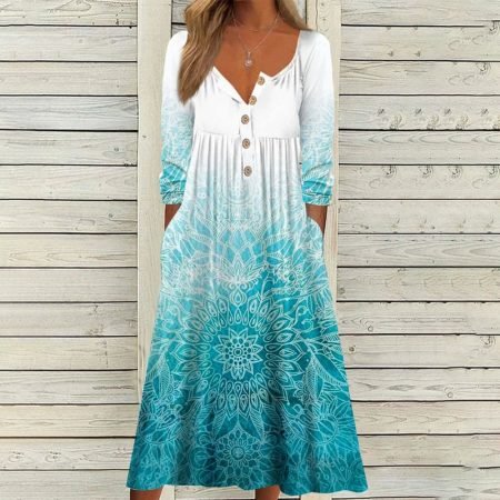 Description: Pattern Type: Print Neckline: Round Neck Sleeve Length: 3/4 Sleeve Dress Length: Midi Silhouette: A-line Side Pockets Material: 40% Elastane, 60% Rayon Machine Washable Size Chart: Size Bust Length Sleeves inch cm inch cm inch cm S 38 96 46 117 18 45 M 39 100 47 120 18 46 L 41 105…