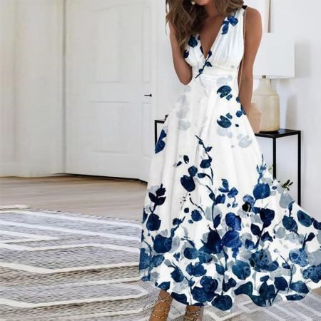 Description: Neckline: V-Neck   Sleeve Length: Sleeveless Pattern Type: Plants  Dress Length: Midi Silhouette: A-line Material: 40% Elastane, 60% Rayon Machine Washable Size Chart: Size Bust Length inch cm inch cm S 35 88 50 127 M 36 92 51 130 L 38 97 52 133 XL 41 103 54 136 XXL 44 111 55 139