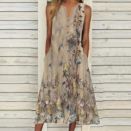 Description: Neckline: V-Neck   Sleeve Length: Sleeveless Pattern Type: Print  Dress Length: Midi Silhouette: A-line Side Pockets Material: 40% Elastane, 60% Rayon Machine Washable Size Chart: Size Bust Length inch cm inch cm S 36 92 46 117 M 38 96 47 120 L 40 101 48 123 XL 42 107 50 126 XXL 45 115…