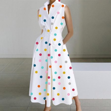Description: Retro vibes all day with this sophisticated, colorful polka-dotted white side pocket dress, perfect for layering with a cardigan or worn solo with its all-over pleating and cinched waist. A sleeveless top and fold-over collar give it a 1950s vibe upgraded with contemporary trends and comfort for your next…