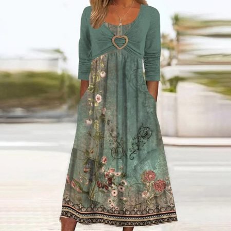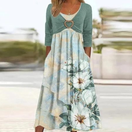 Description: This floral print maxi dress features a twofer design with a faux mini long sleeve top and connected heart element in the middle. Oversized watercolor flowers splashed across this dress highlight the tiered layers, giving it a bohemian vintage style. Dress Length: Midi Neckline: Round Neck Sleeve Length: Long Sleeve…