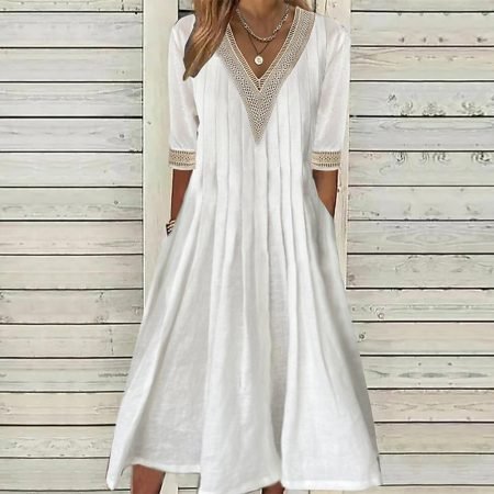 Description: Neckline: V-Neck Sleeve Length: Half Sleeve Dress Length: Midi Silhouette: A-line Pattern Type: Plain Side Pockets Material: 45% Elastane, 55% Rayon Machine Washable Size Chart: Size Bust Length Sleeves inch cm inch cm inch cm S 38 96 46 117 11 29 M 39 100 47 120 12 30 L 41 105 48 123 12…