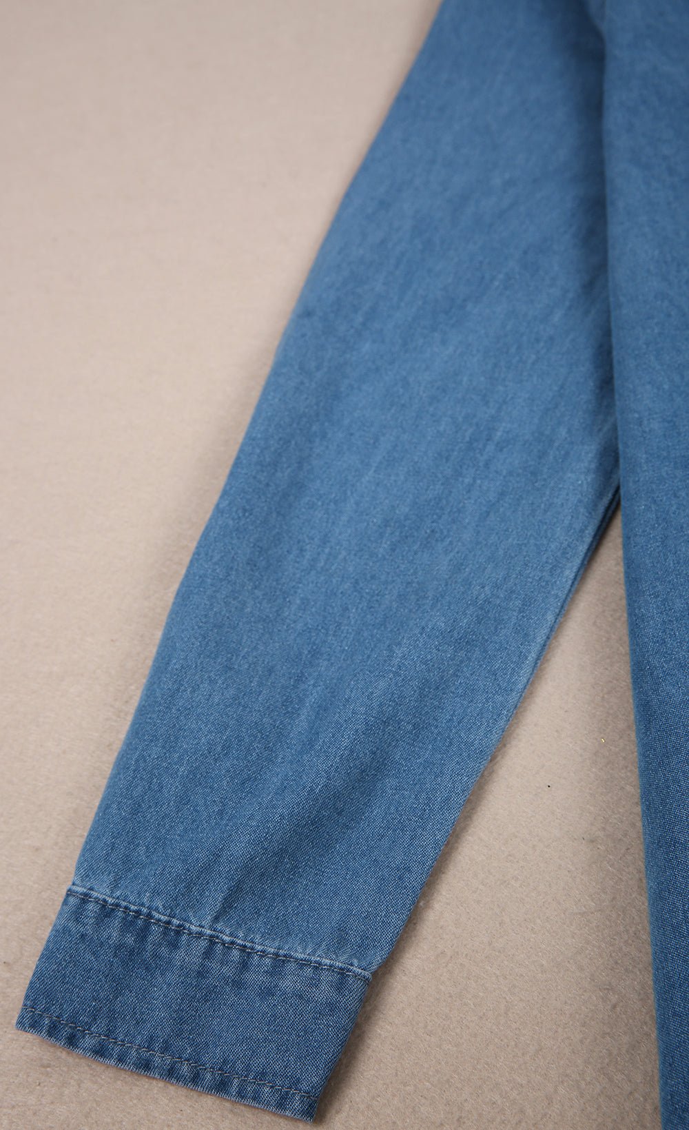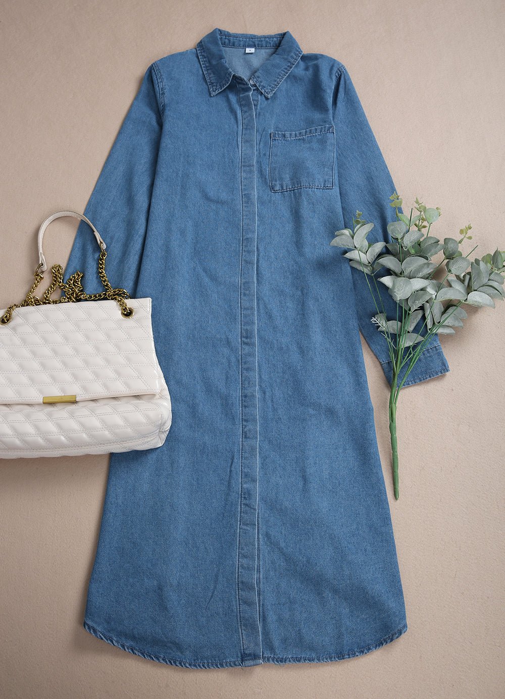 This effortless and classic chambray denim blouse gets a modern upgrade with a loose-fitting knee-length silhouette, versatile and perfect for wearing with a cinched belt. The button front, fold-over collar, and long sleeves provide just enough coverage for any day. Wear this dress open as a cardigan duster jacket. Wash in gentle or delicate cycle with light colors. Keep away from dark colors.