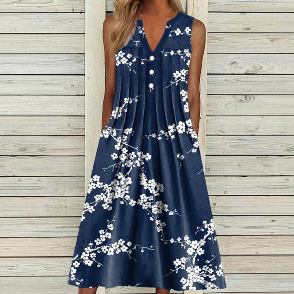 Description: Neckline: V-neck Sleeve Length: Sleeveless Dress Length: Midi Pattern Type: Floral Silhouette: A-line Side Pockets Material: 35% Elastane, 65% Rayon Machine Washable Size Chart: Size Bust Length inch cm inch cm S 36 92 50 127 M 38 96 51 130 L 40 101 52 133 XL 42 107 54 136 2XL 45…
