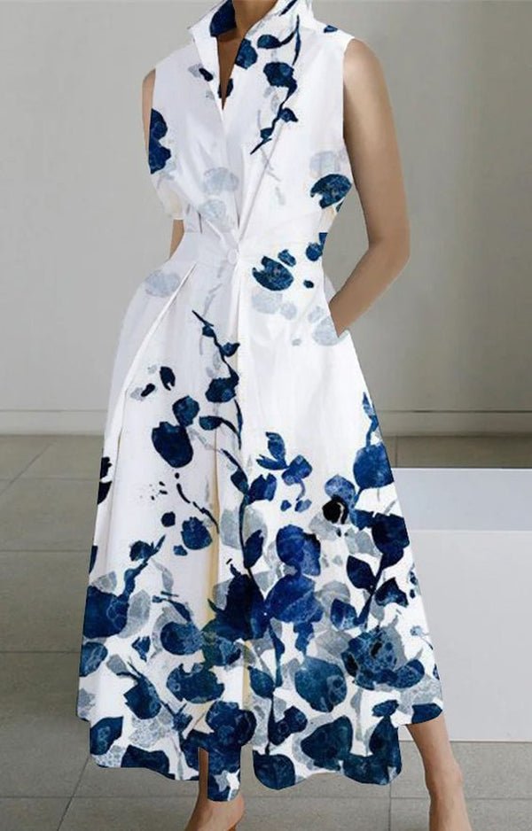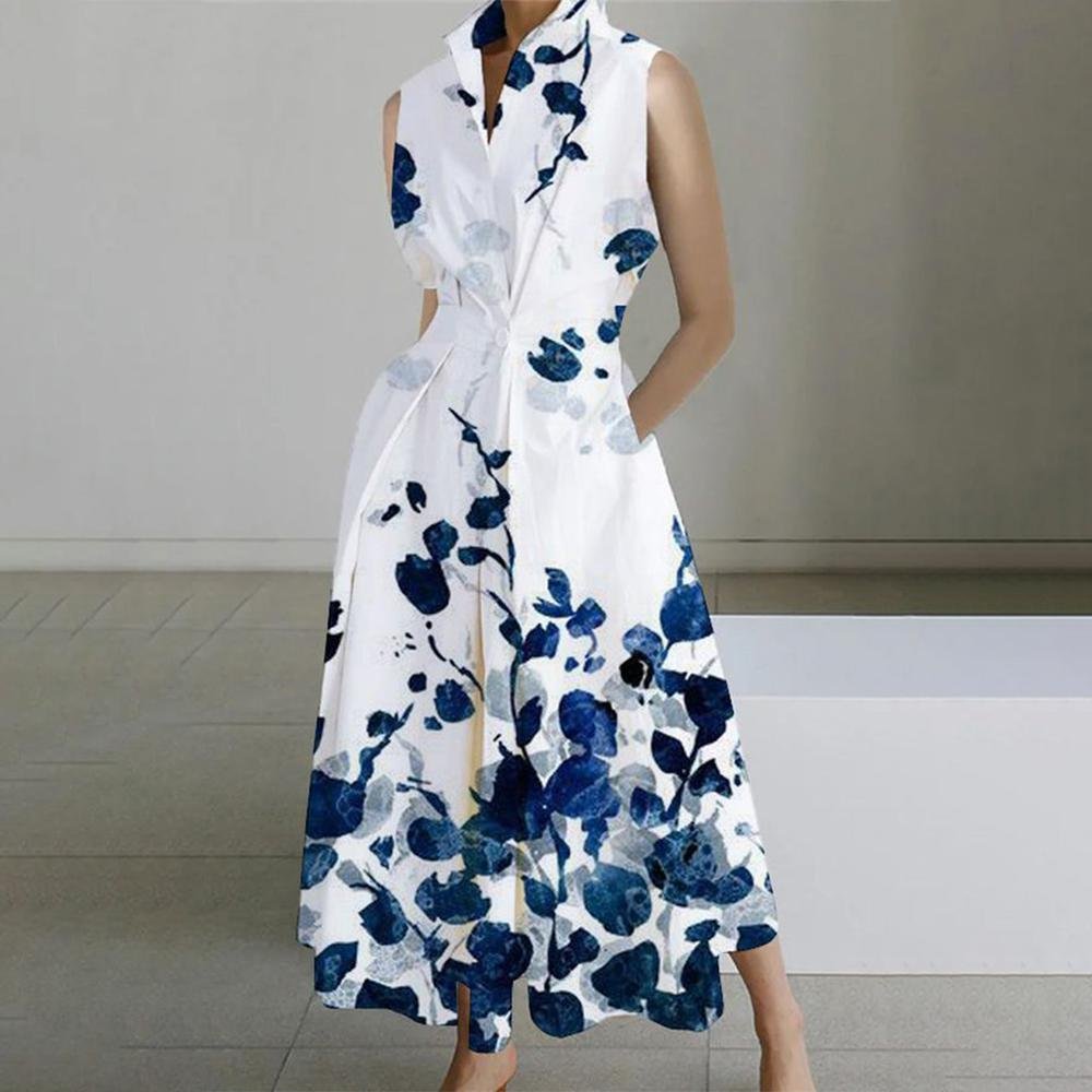 Description: Sleeve Length: Sleeveless Dress Length: Midi Pattern Type: Print Collared Silhouette: A-line Side Pockets Material: 40% Elastane, 60% Rayon Machine Washable Size Chart: Size Bust Length inch cm inch cm S 38 96 52 132 M 39 100 53 135 L 41 105 54 138 XL 44 111 56 141 XXL…