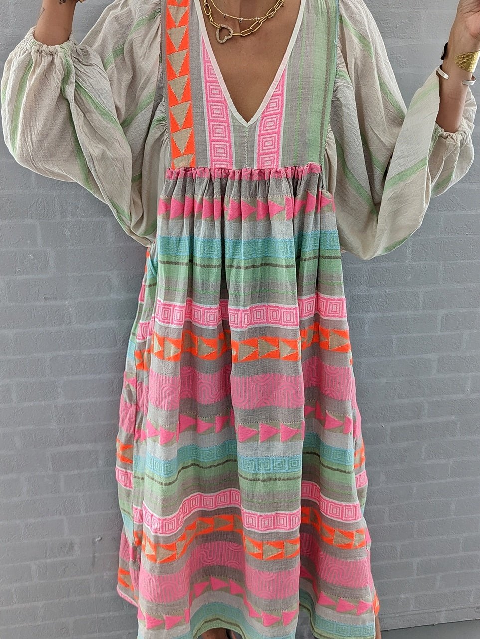 Pink Greek Key and Orange Chain Striped Print Midi Dress