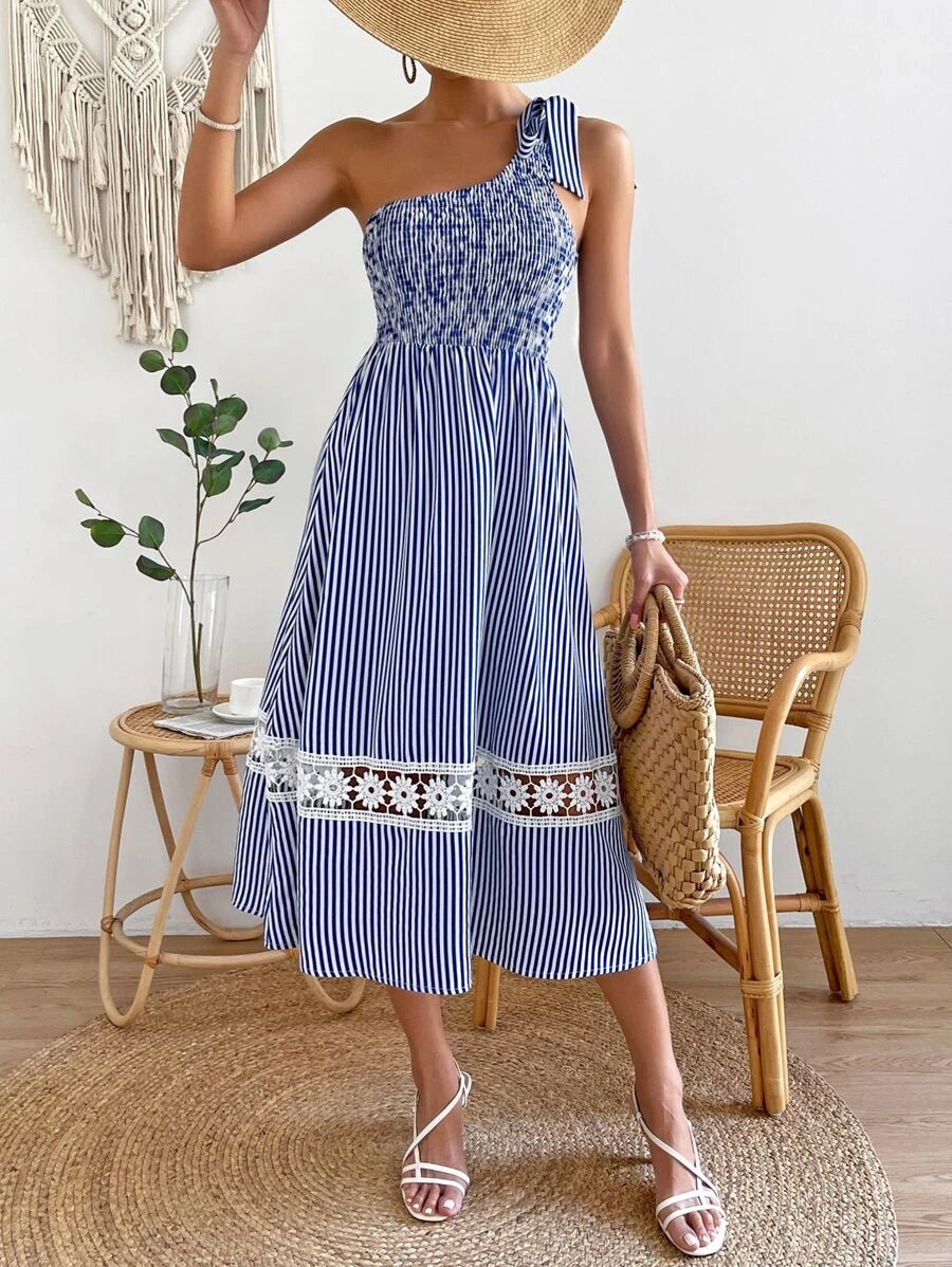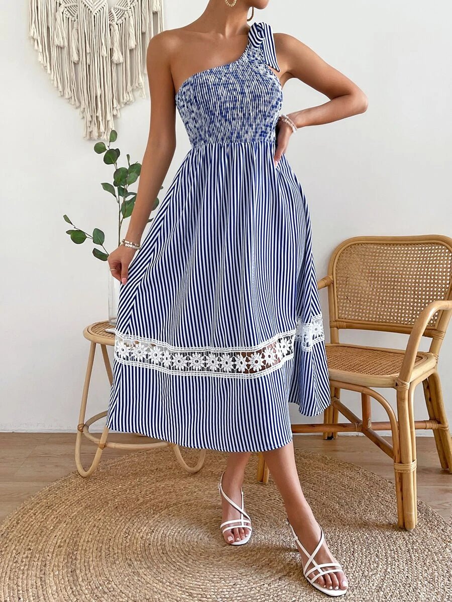 Blue Striped One Shoulder Midi Dress