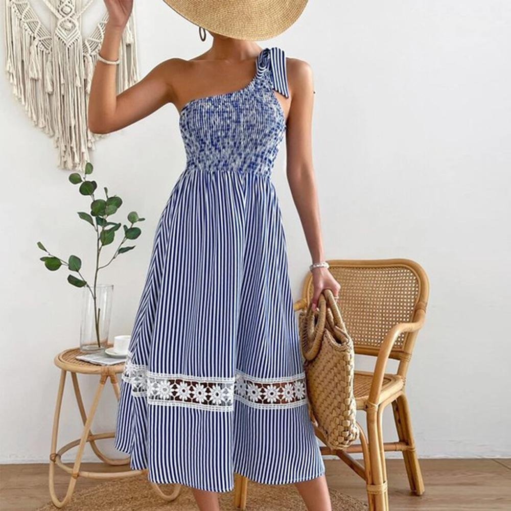 Description: Sleeve Length: Sleeveless Neckline: One Shoulder  Dress Length: Midi Silhouette: A-line Pattern Type: Striped Material: 45% Elastane, 55% Rayon Machine Washable Size Chart: Size Bust Length inch cm inch cm S 32 82 44 112 M 34 86 45 115 L 36 91 46 118 XL 38 97 48 121 XXL 41 105 49…