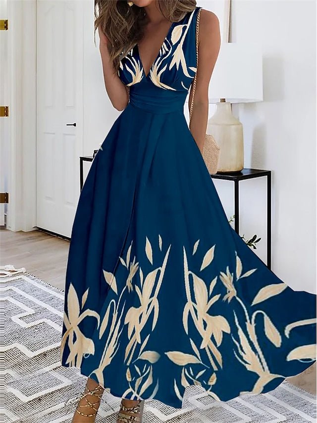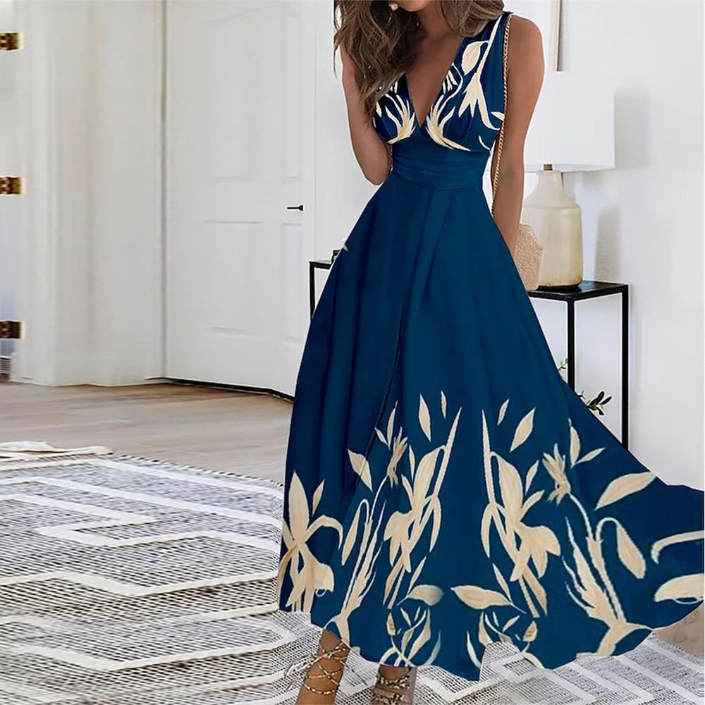 Description: Neckline: V-neck Sleeve Length: Sleeveless Dress Length: Midi Pattern Type: Print Silhouette: Fit and Flare Material: 45% Elastane, 55% Rayon Machine Washable Size Chart: Size Bust Length inch cm inch cm S 35 88 50 127 M 36 92 51 130 L 38 97 52 133 XL 41 103 54 136…