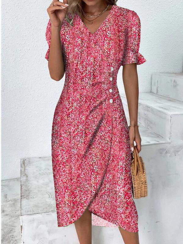This pretty uneven hem mini dress features a chic wrapped look with asymmetrically placed buttons on the front, a v-neck collar, and puffed short sleeves. The tiny pink and red roses cover this dress in romantic color, perfect for wearing to any occasion.