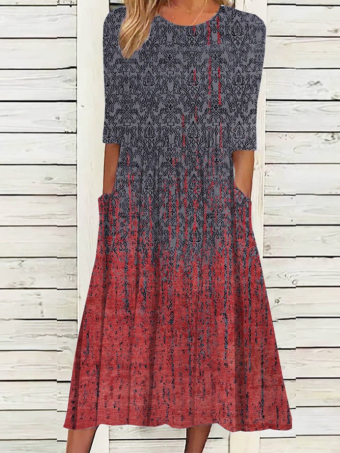 This midi-length prairie dress will become your favorite go-to with its rich red to blue ombre ornate print. The crewneck collar and half sleeves make it easy to mix and match with a jacket. A loose-fitting waist with double side pockets and pleats finish the look.