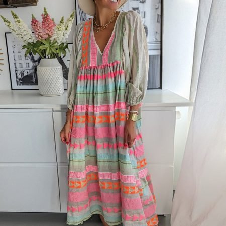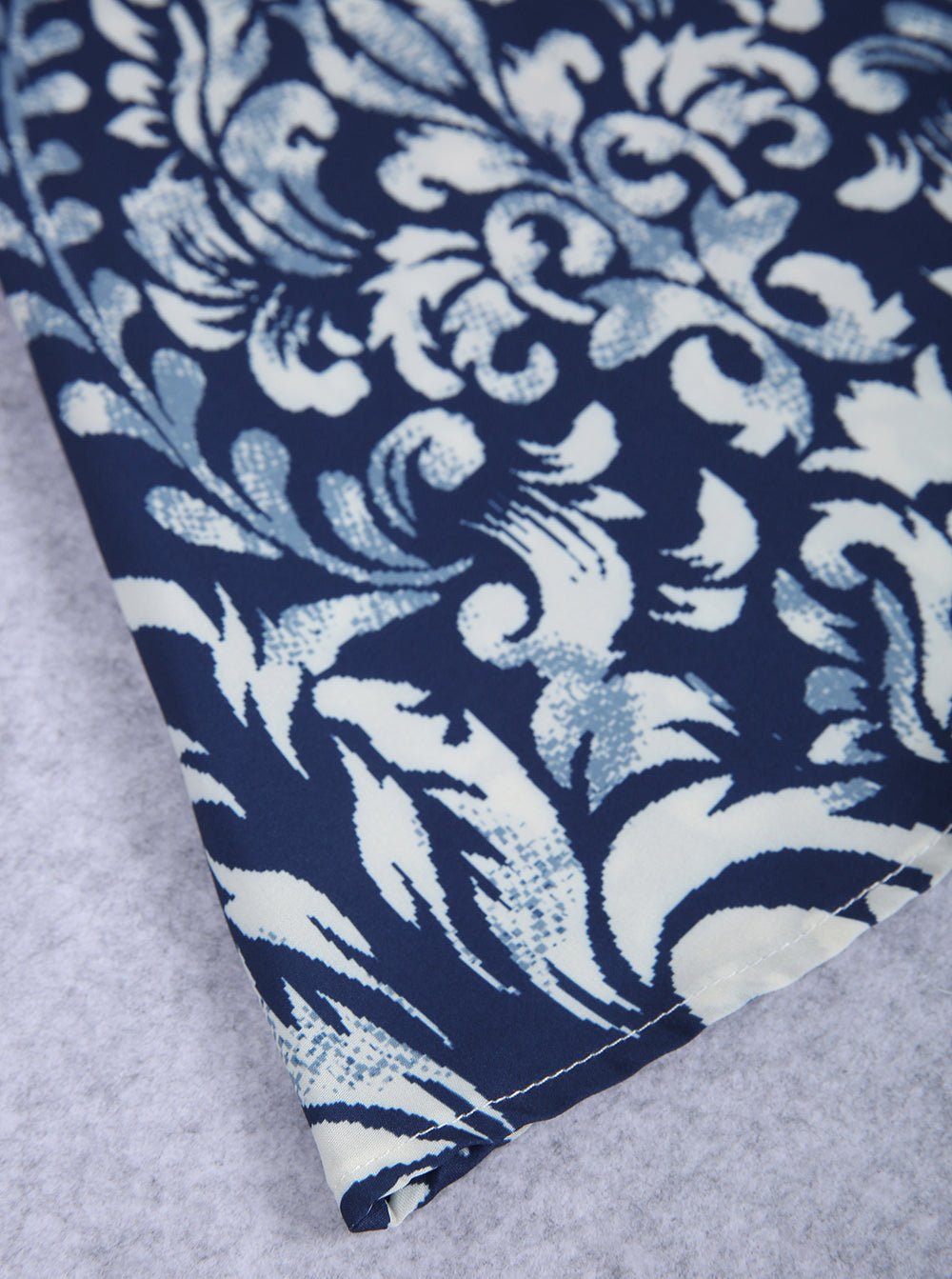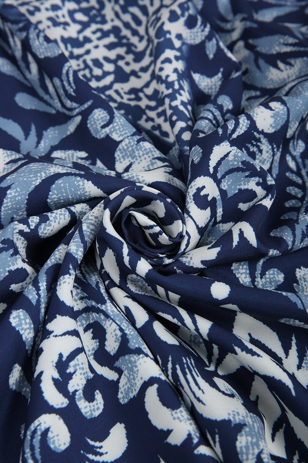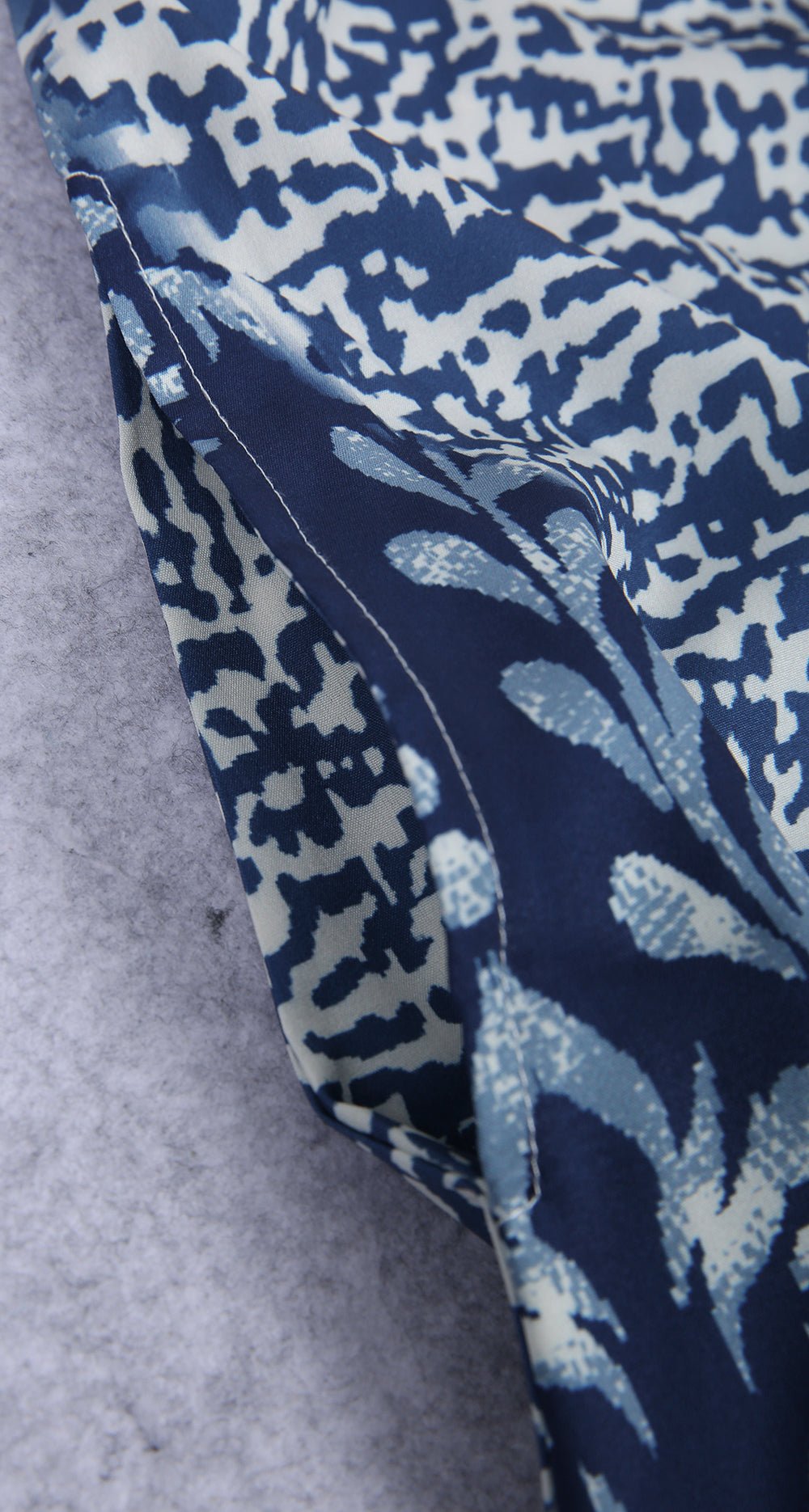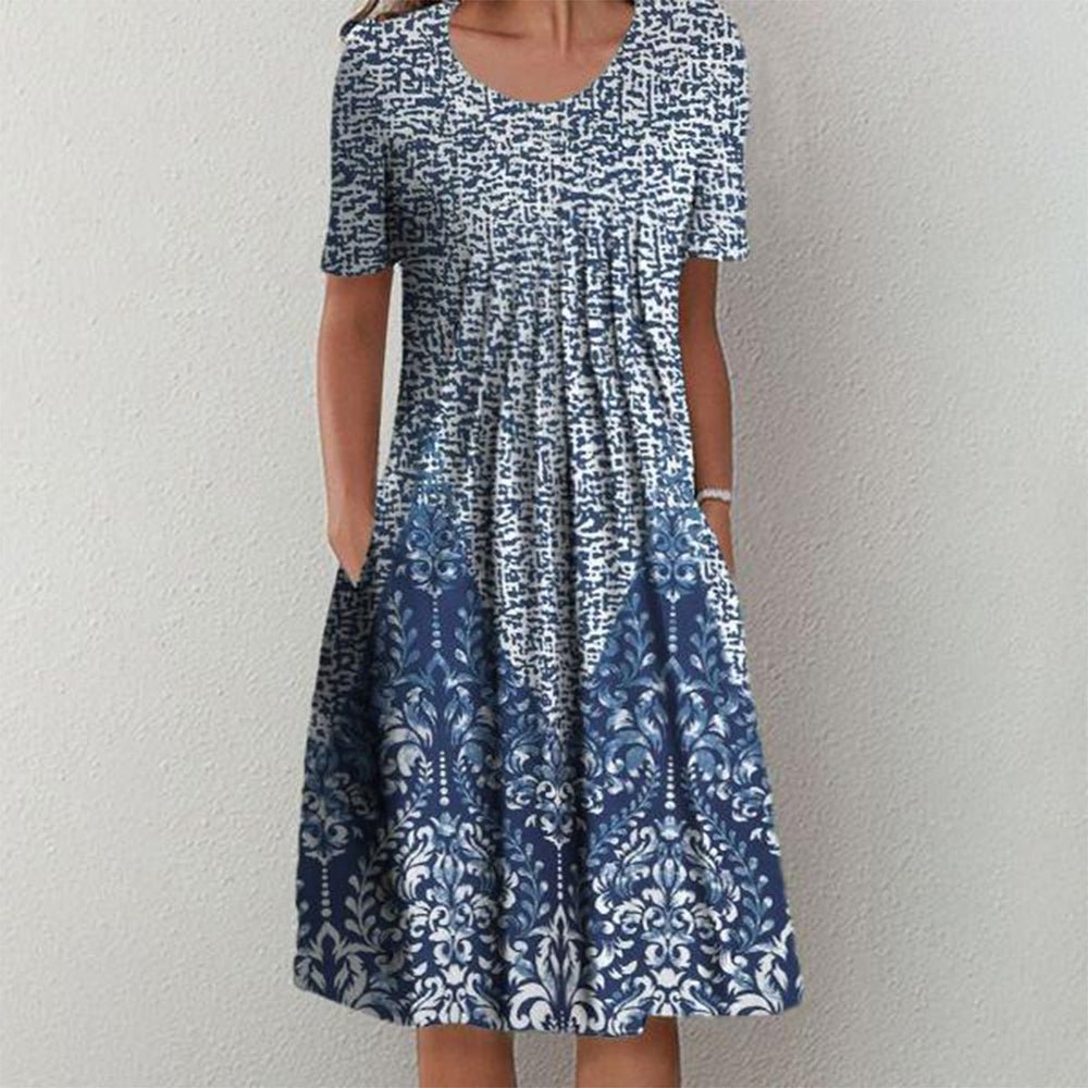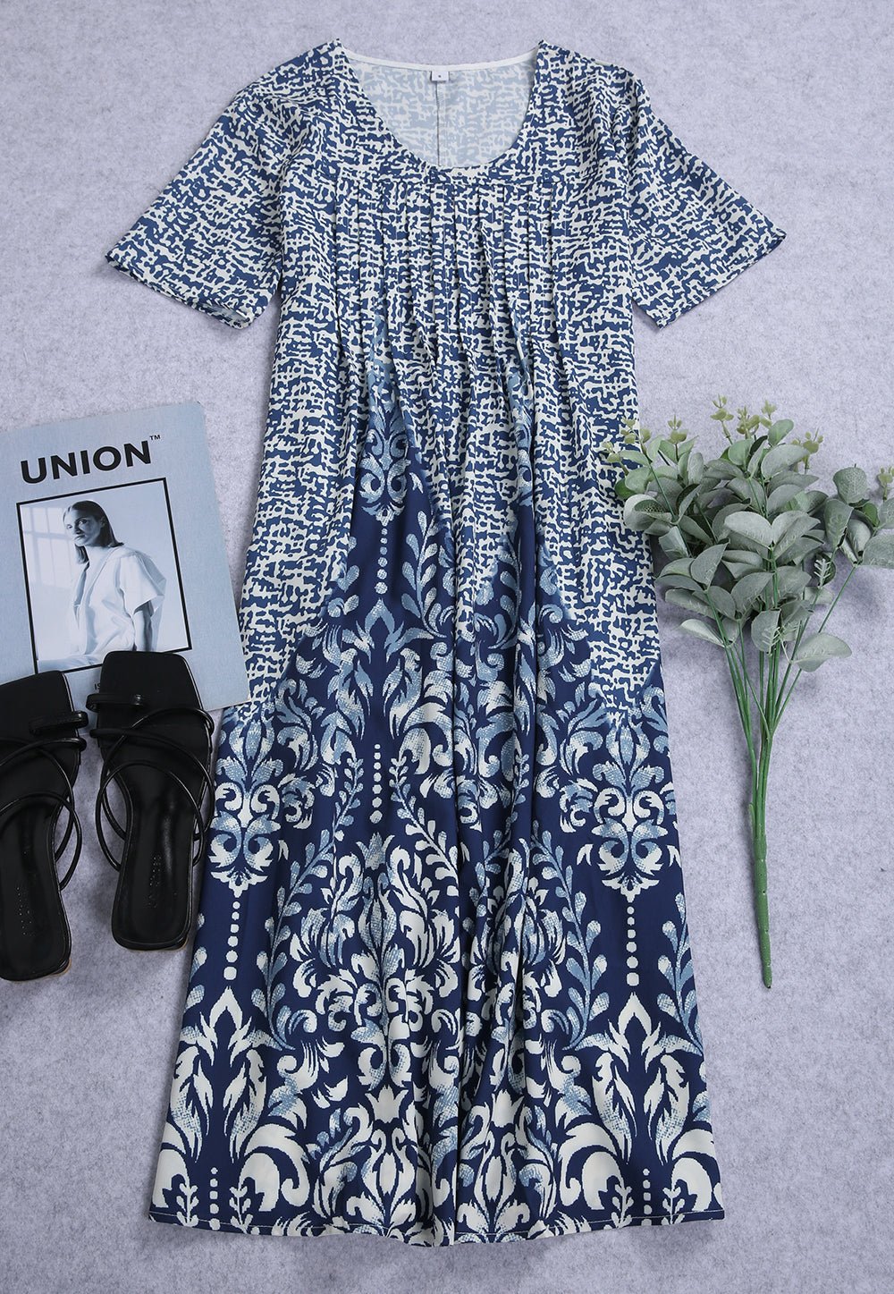 This lightweight midi dress features a beautiful dark cobalt-royal blue paisley-inspired vintage print on the bottom that gives way to a broken line pattern on the top. A round neck collar, short length sleeves, and a midi silhouette make this prairie dress perfect for dressing up or down. Finish your look with booties, a denim jacket, and layering necklaces. Machine wash cold tumble dry low to medium heat. Iron if needed or lay flat to dry.