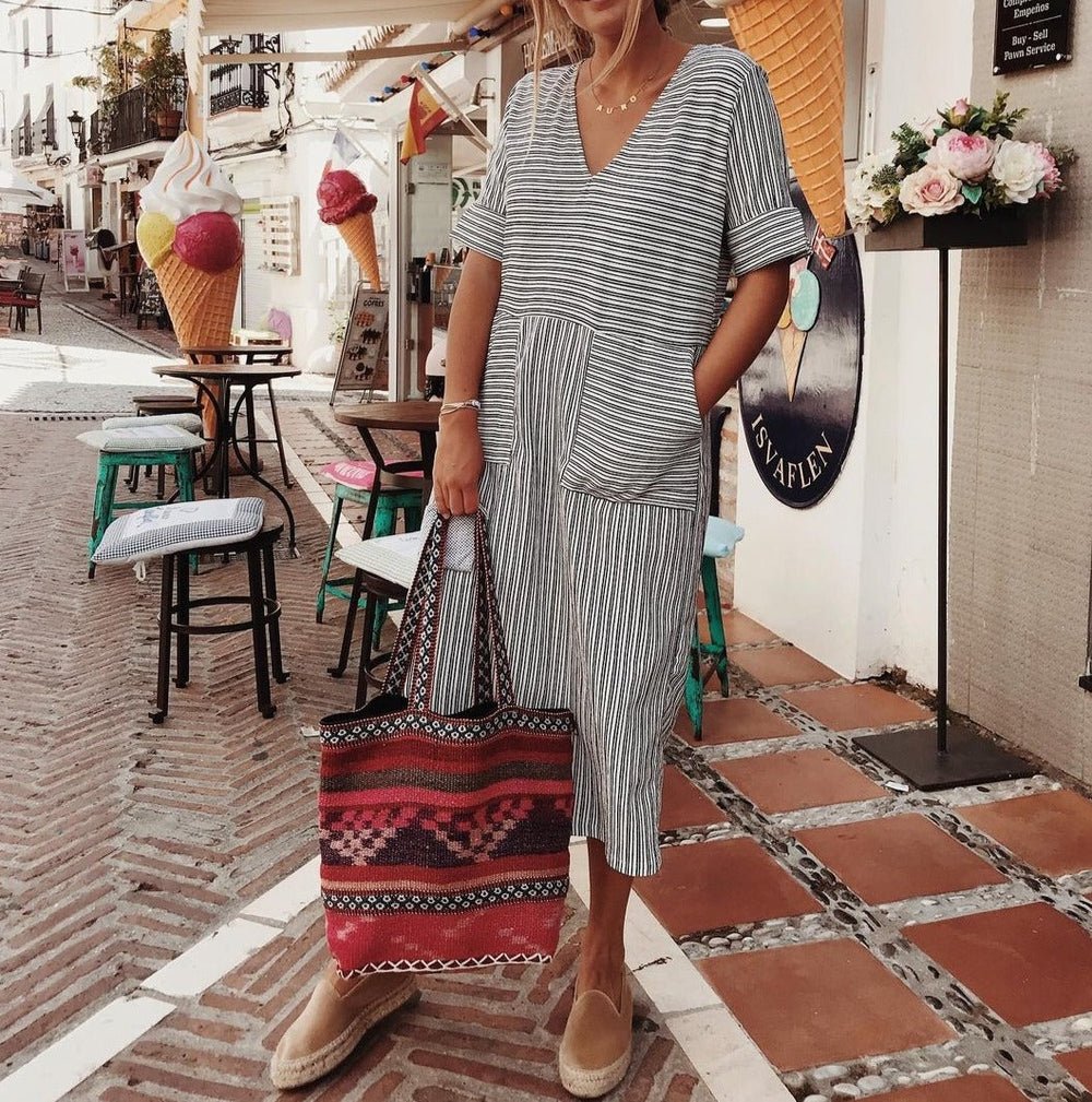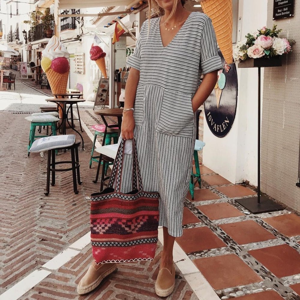 Description: Neckline: V-Neck Sleeve Length: Short Sleeve Dress Length: Midi Silhouette: Shift Pattern Type: Striped Side Pockets Material: 45% Elastane, 55% Rayon Machine Washable Size Chart: Size Bust Length Sleeves inch cm inch cm inch cm S 38 96 42 107 9 24 M 39 100 43 110 10 25 L 41 105 44…