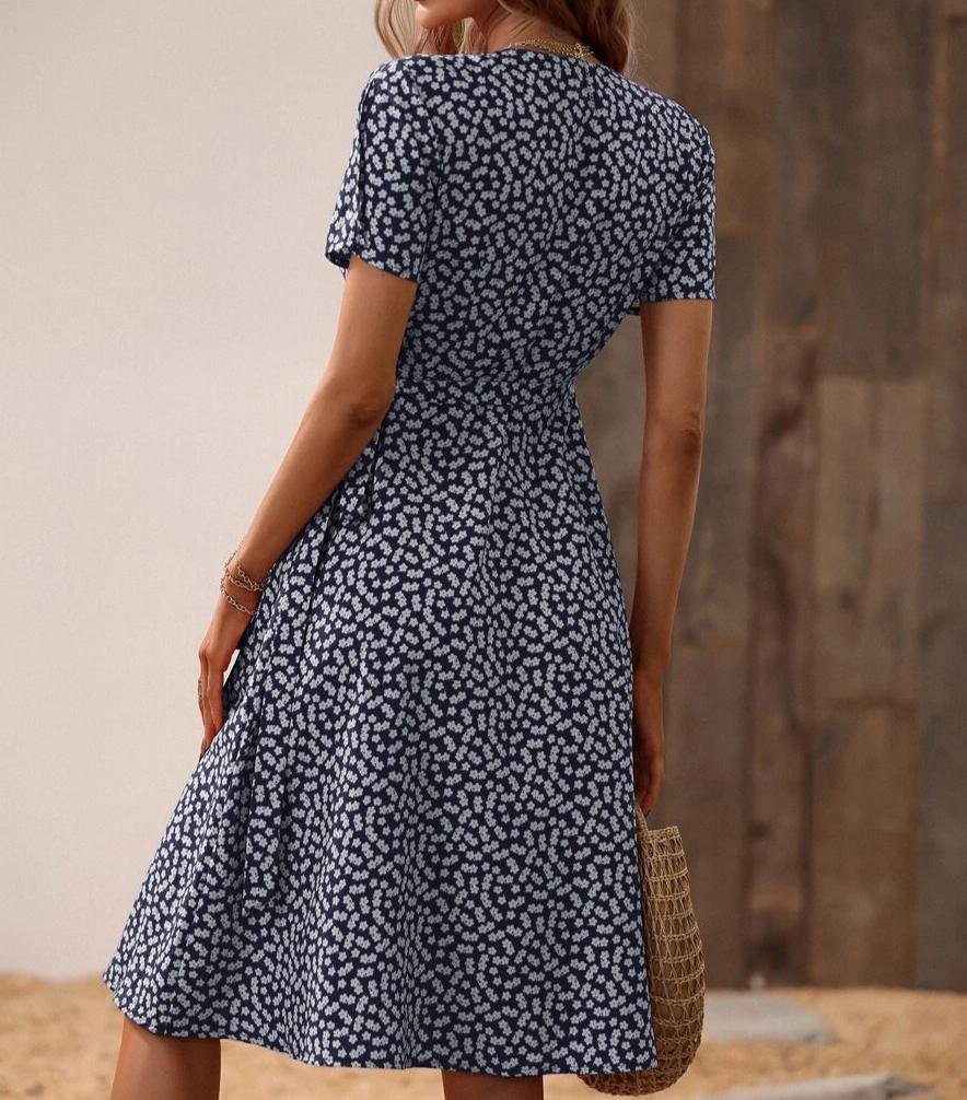 Navy Short Sleeve Print Midi Dress