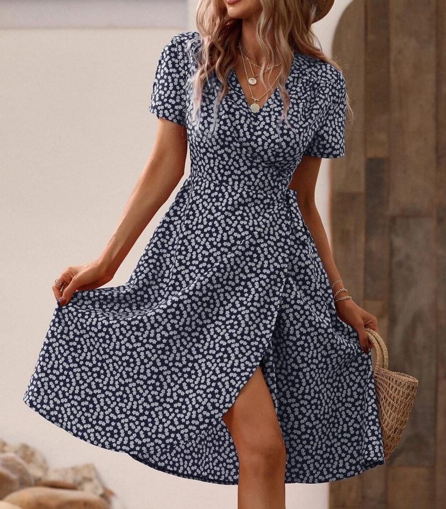 Description: Neckline: V-neck Sleeve Length: Short Sleeve Dress Length: Midi Silhouette: A-line Pattern Type: Print Thigh-high Side Slit Material: 45% Elastane, 55% Rayon Machine Washable Size Chart: Size Bust Length Sleeves inch cm inch cm inch cm S 36 92 44 113 7 19 M 38 96 45 115 8 20 L 40…