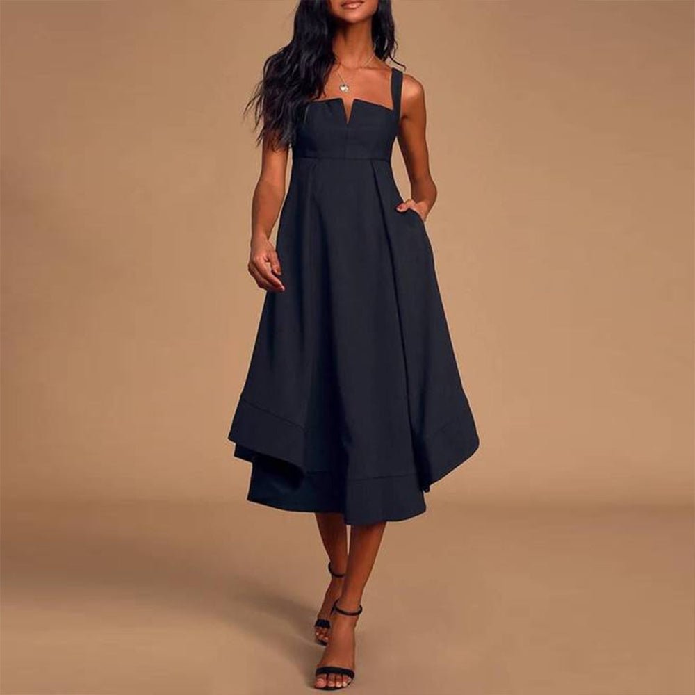 Description: This beautiful calf-length summer dress is a must-have for any fashionista, elegant and effortless. The straps and square neckline highlight the collar with a small cut-out v, perfect for showing off your lightweight necklaces. The chic empire waist and layered silhouette with side pockets make it versatile for any…