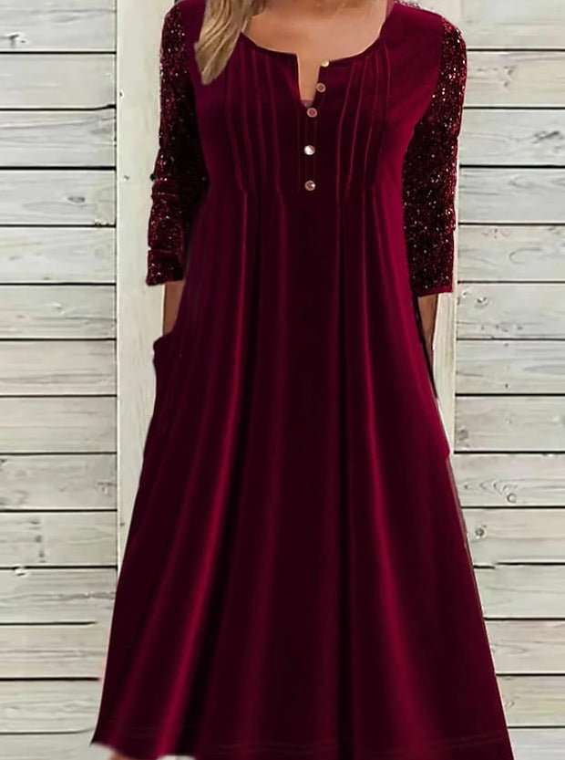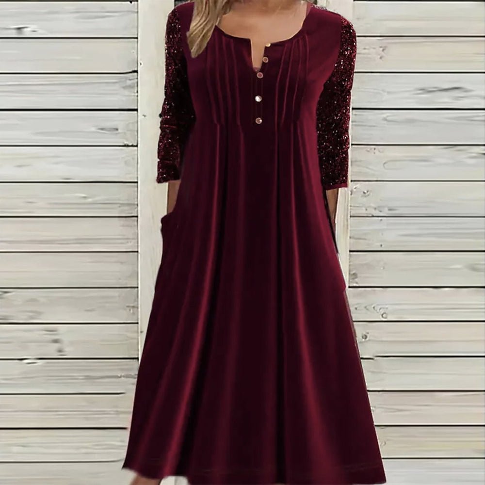 Description: Sleeve Length: 3/4 Sleeve Round Neck Dress Length: Midi Silhouette: A-line Pattern Type: Print Side Pockets Material: 35% Elastane, 65% Rayon Machine Washable Size Chart: Size Bust Length Sleeves inch cm inch cm inch cm S 38 96 46 117 15 37 M 39 100 47 120 15 38 L 41 105 48…