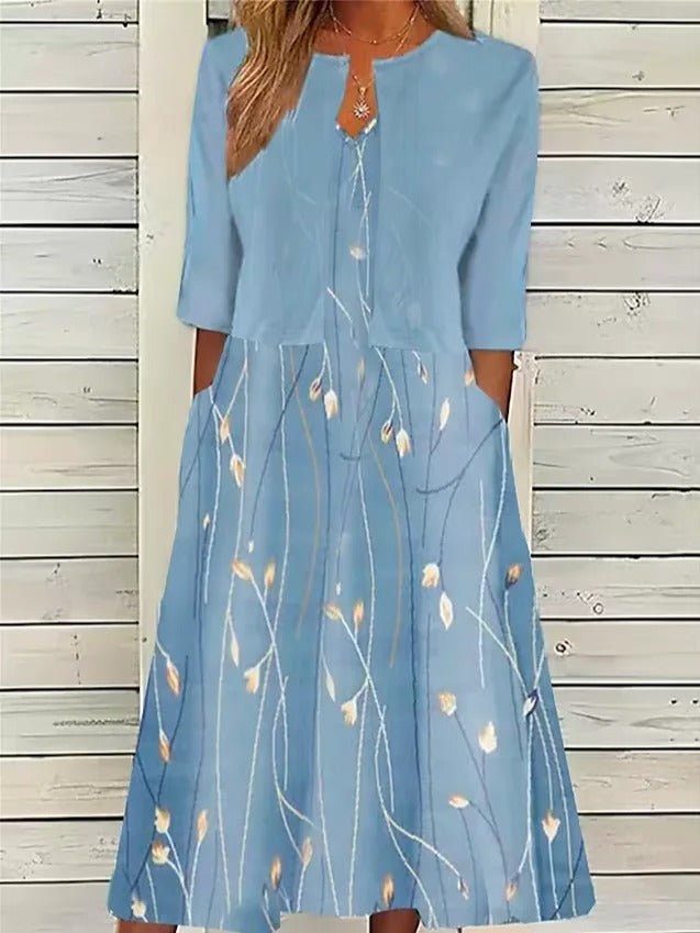 This chic summer dress features a twofer design, which means it gives the appearance of two separate pieces. The top of the dress is designed like a short jacket, with a basic blue and a half-sleeve, offering comfort and warmth. The bottom of the dress is a midi-length skirt with a beautiful floral print all over, adding a pop of color.