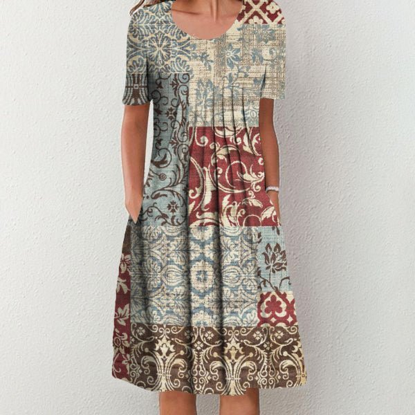 Description: Neckline: Round Neck Sleeve Length: Short Sleeve Dress Length: Midi Silhouette: A-line Pattern Type: Print Side Pockets Material: 40% Elastane, 60% Rayon Machine Washable Size Chart: Size Bust Length Sleeves inch cm inch cm inch cm S 38 96 42 107 9 23 M 39 100 43 110 9 24 L 41…