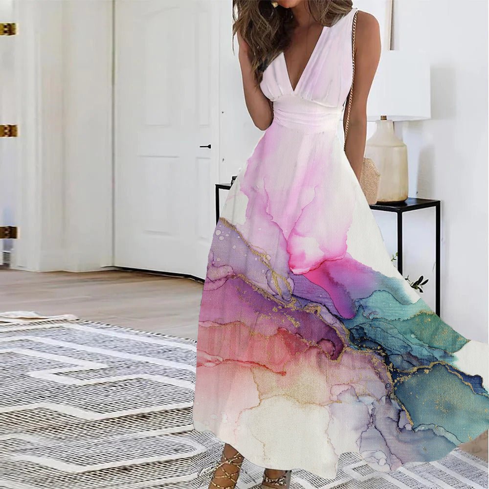 Description: Neckline: V-Neck Sleeve Length: Sleeveless Dress Length: Midi Pattern Type: Print Silhouette: A-line Material: 45% Elastane, 55% Rayon Machine Washable Size Chart: Size Bust Length inch cm inch cm S 35 88 50 127 M 36 92 51 130 L 38 97 52 133 XL 41 103 54 136 XXL 44 111 55…