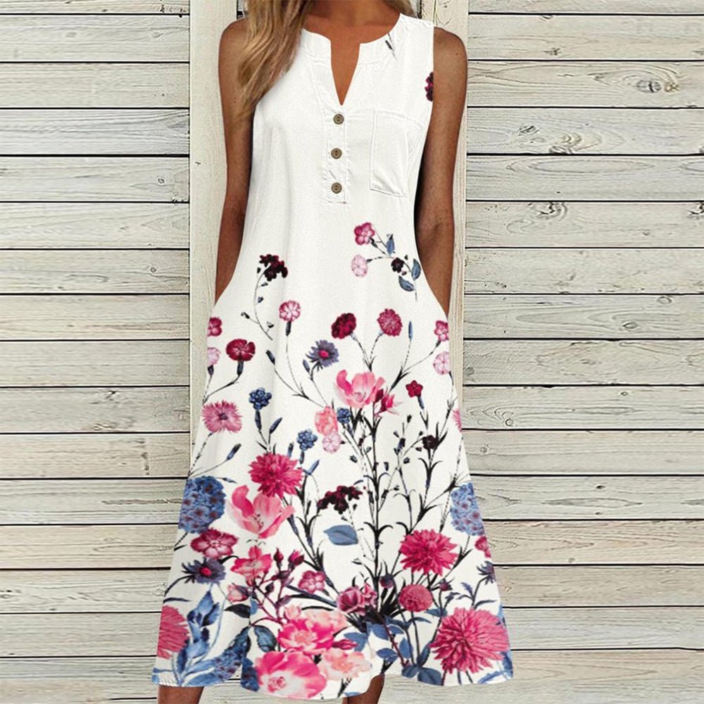 Description: Sleeve Length: Sleeveless Pattern Type: Floral Dress Length: Midi Neckline: Round Neck Side Pockets Silhouette: A-line Material: 35% Elastane, 65% Rayon Machine Washable Size Chart: Size Bust Length inch cm inch cm S 36 92 46 117 M 38 96 47 120 L 40 101 48 123 XL 42 107 50…