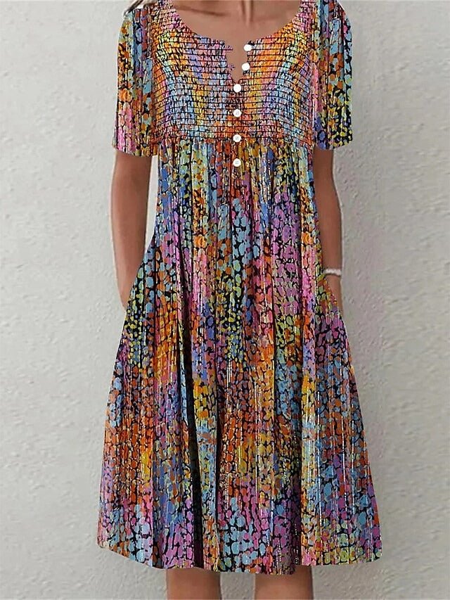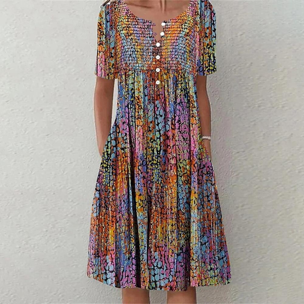 Description: Neckline: Round Neck Sleeve Length: Short Sleeve Dress Length: Midi Pattern Type: Print Silhouette: A-line Side Pockets Material: 35% Elastane, 65% Rayon Machine Washable Size Chart: Size Bust Length Sleeves inch cm inch cm inch cm S 35 88 42 107 9 23 M 36 92 43 110 9 24 L 38…