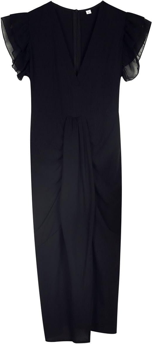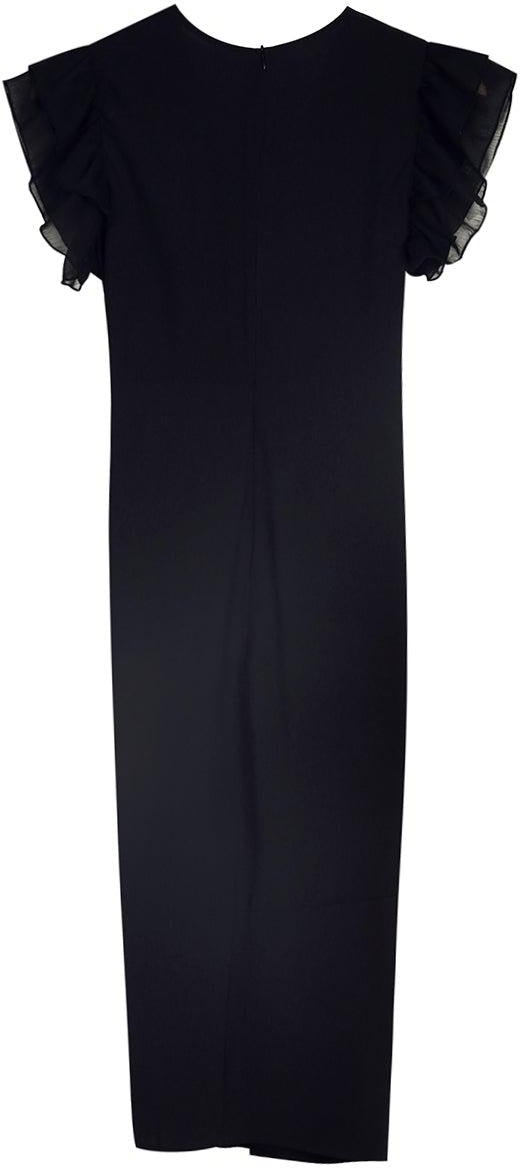 Get noticed with this elegant and sultry knee-length high-slit dress. The flirty double ruffle sheer sleeveless and plunging v-neck collar make this dress picture-worthy and perfect for an event, a date, or a special occasion. The high slit on the front can be paired with heels, pumps, flats, or boots for any weather. Machine wash cold tumble dry low to medium heat. Iron if needed or lay flat to dry.