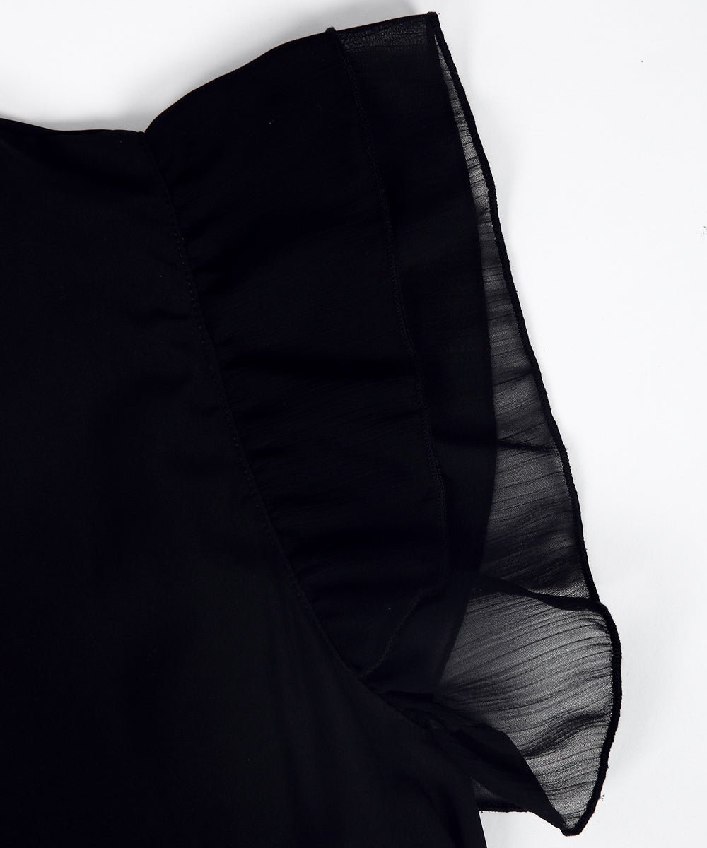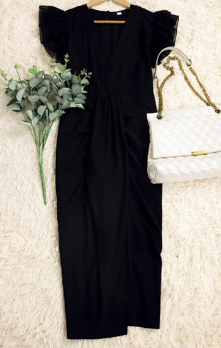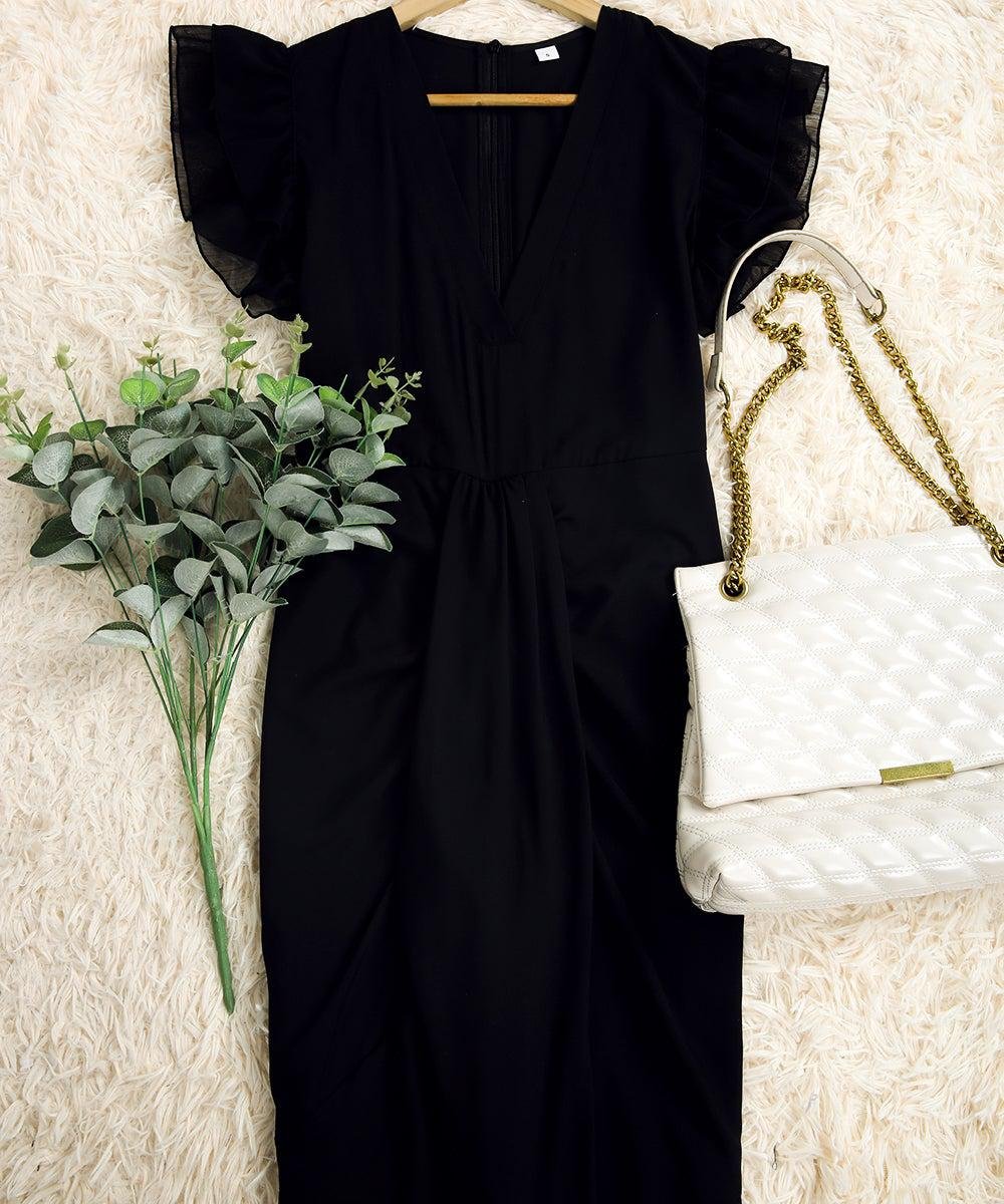 Description: Get noticed with this elegant and sultry knee-length high-slit dress. The flirty double ruffle sheer sleeveless and plunging v-neck collar make this dress picture-worthy and perfect for an event, a date, or a special occasion. The high slit on the front can be paired with heels, pumps, flats, or boots…