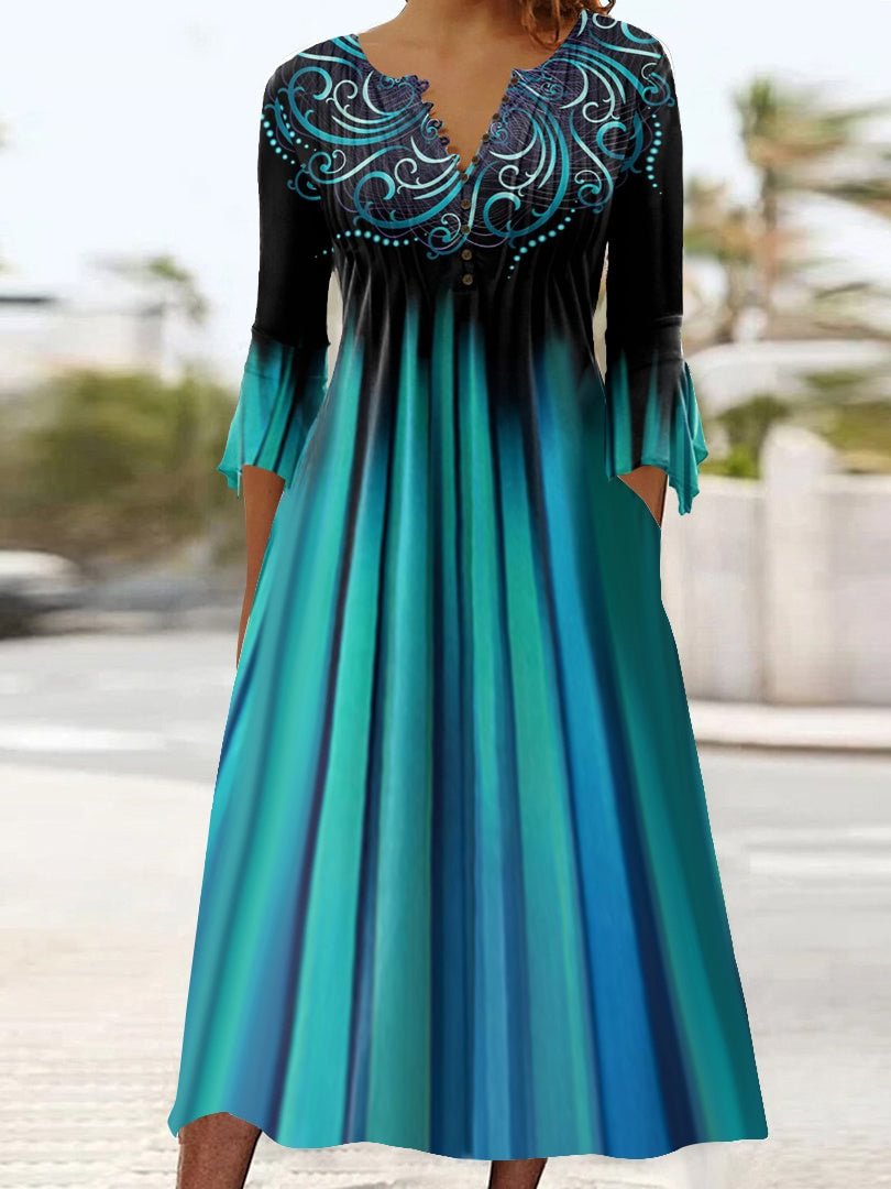 Description: This sophisticated midi dress says it all, with ombre green stripes running vertically down the mid-calf silhouette. The short sleeves with a luxe swirling ribbon print and v-neck give it a glam detail. The cinched bodice with ¾ sleeves complements the flared hem. Neckline: Round Neck Sleeve Length: 3/4 Sleeve Dress…