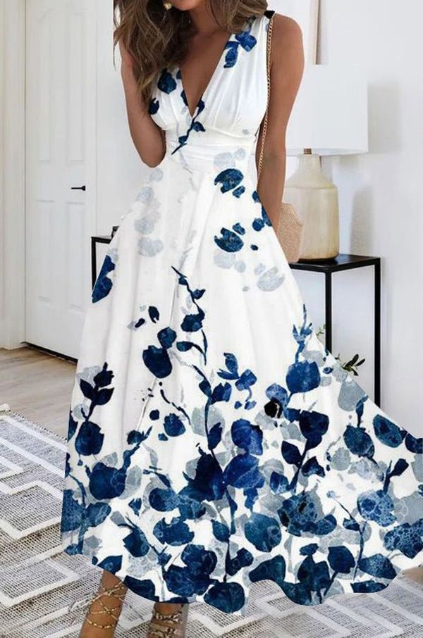 Description: Neckline: V-Neck   Sleeve Length: Sleeveless Pattern Type: Plants  Dress Length: Midi Silhouette: A-line Material: 40% Elastane, 60% Rayon Machine Washable Size Chart: Size Bust Length inch cm inch cm S 35 88 50 127 M 36 92 51 130 L 38 97 52 133 XL 41 103 54 136 XXL 44 111 55 139